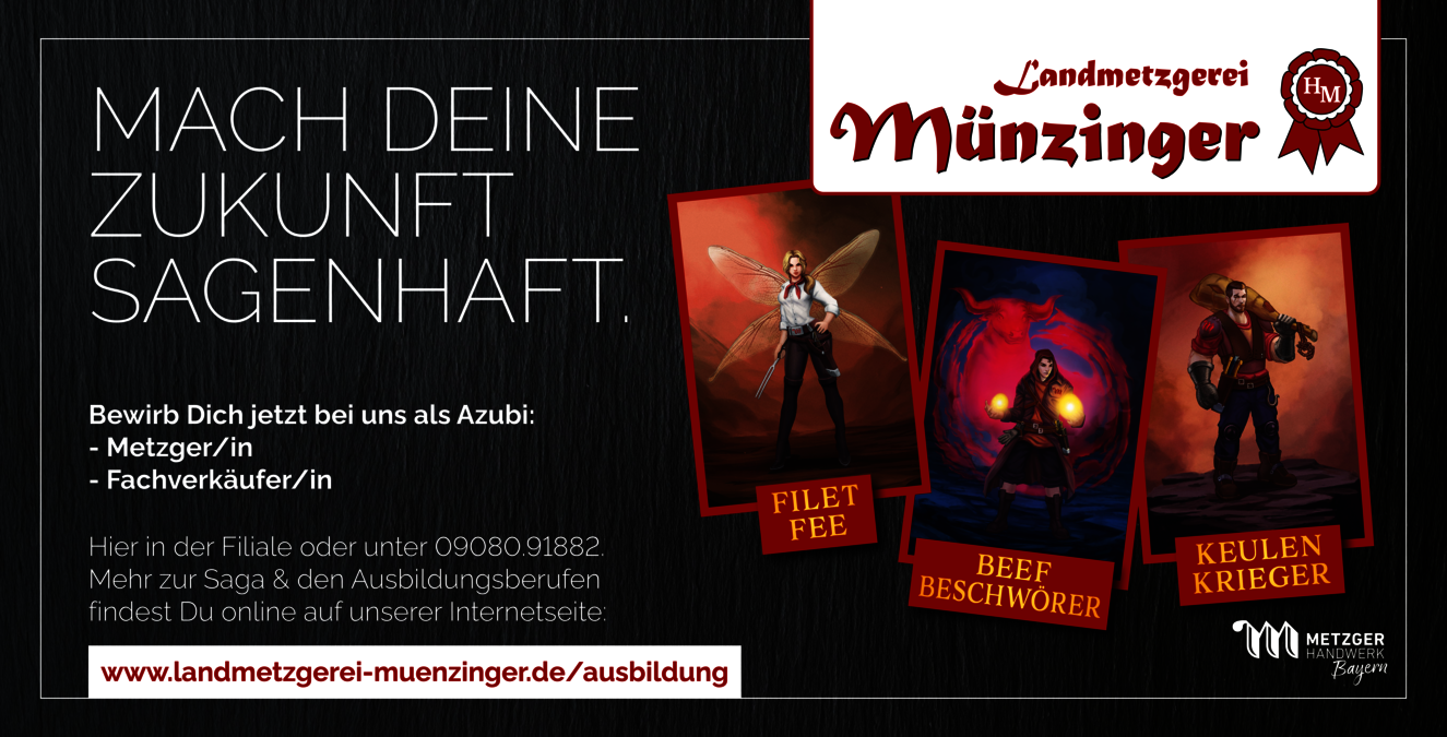 Die duale Ausbildung findet in unserem Betrieb durch den Innungsobermeister Harald Münzinger statt und die Berufsschule kannst du in Augsburg bzw. Nördlingen besuchen. Mehr Informationen zu den Ausbildungsberufen findest du unter www.fleischerhandwerk.de